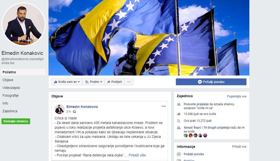 S druge strane Facebook je mnogo draži političarima poput Elmedina Konakovića, predsjednika Skupštine KS. Njegova službena stranica na Facebooku ima više od 13.000 pratitelja. Redovno iznosi politički stav o aktualnim događanjima na političkoj sceni, kritizira, brani i promovira svoj rad.
