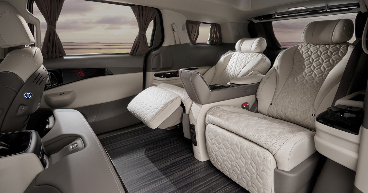 Što je još važnije, Kia je poboljšala kvalitetu vožnje verzije s četiri sjedala dodavanjem posebnih amortizera, preradom ovjesa i nižim položajem sjedenja. Putnici na stražnjim sjedalima uživaju u 21,5-inčnom zaslonu montiranom na krov s osvježenom grafikom, 7-inčnom kontrolnom zaslonu osjetljivom na dodir u središnjoj konzoli, bežičnim podlogama za punjenje, sklopivim stolovima, vješalici za kapute i hladnjaku.