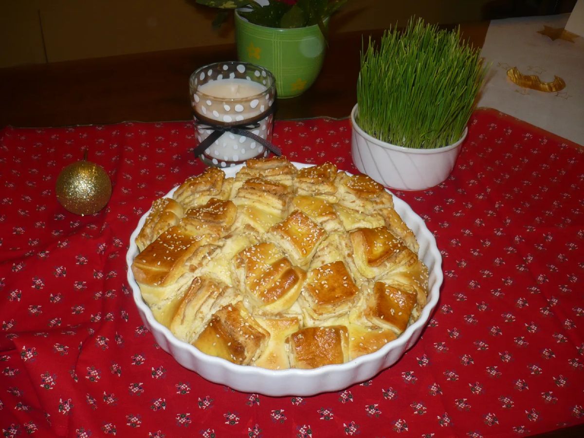 Sve četiri kore složite jednu na drugu, zatim ih zajedno razvaljajte i narežite na komade po želji. Narezanu pogaču složite u namašćen okrugli pekač promjera 26–28 cm. Pokrijte ih i ostavite da se dižu još oko 20 minuta.
