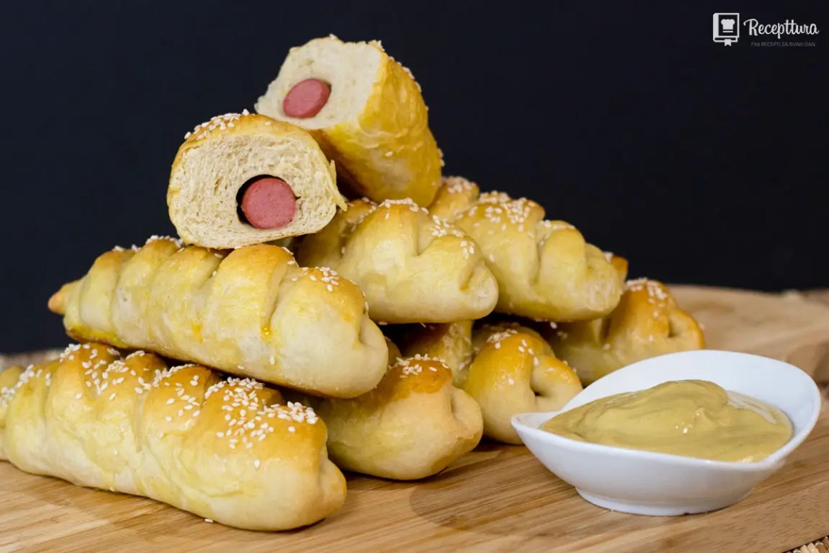 Nakon dizanja, tijesto premijesite i podijelite na 12 jednakih dijelova (svaki otprilike 80 g). Svaku lopticu razvaljajte u pravokutnik i po dužim stranama zarežite tijesto na više mjesta. U sredinu položite hrenovku, a zatim preklapajte trakice tijesta naizmjenično s obje strane kako biste dobili pleteni izgled.