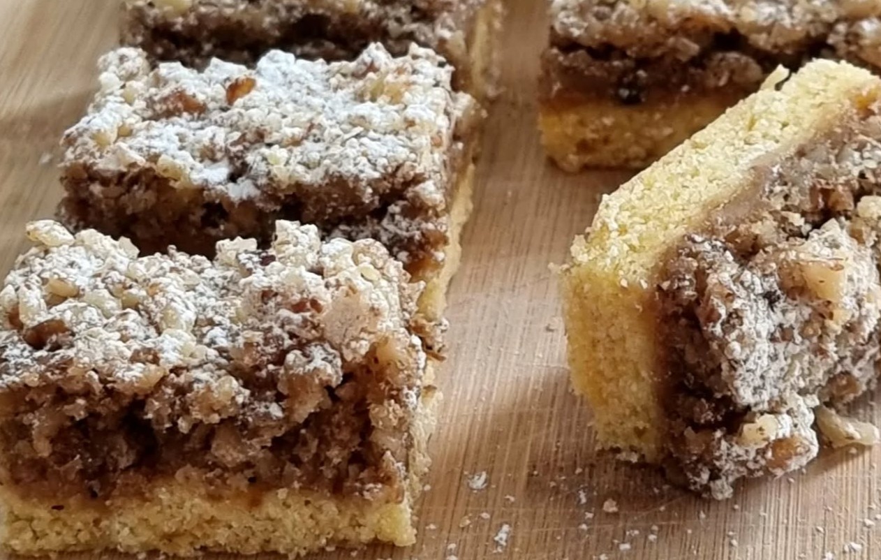 Dobiveni nadjev rasporedite preko marmelade, a po vrhu pospite krupno sjeckane orahe. Kolač vratite u pećnicu i pecite još 10-ak minuta, dok se nadjev lagano ne zapeče i dobije svijetlu zlatnu boju.