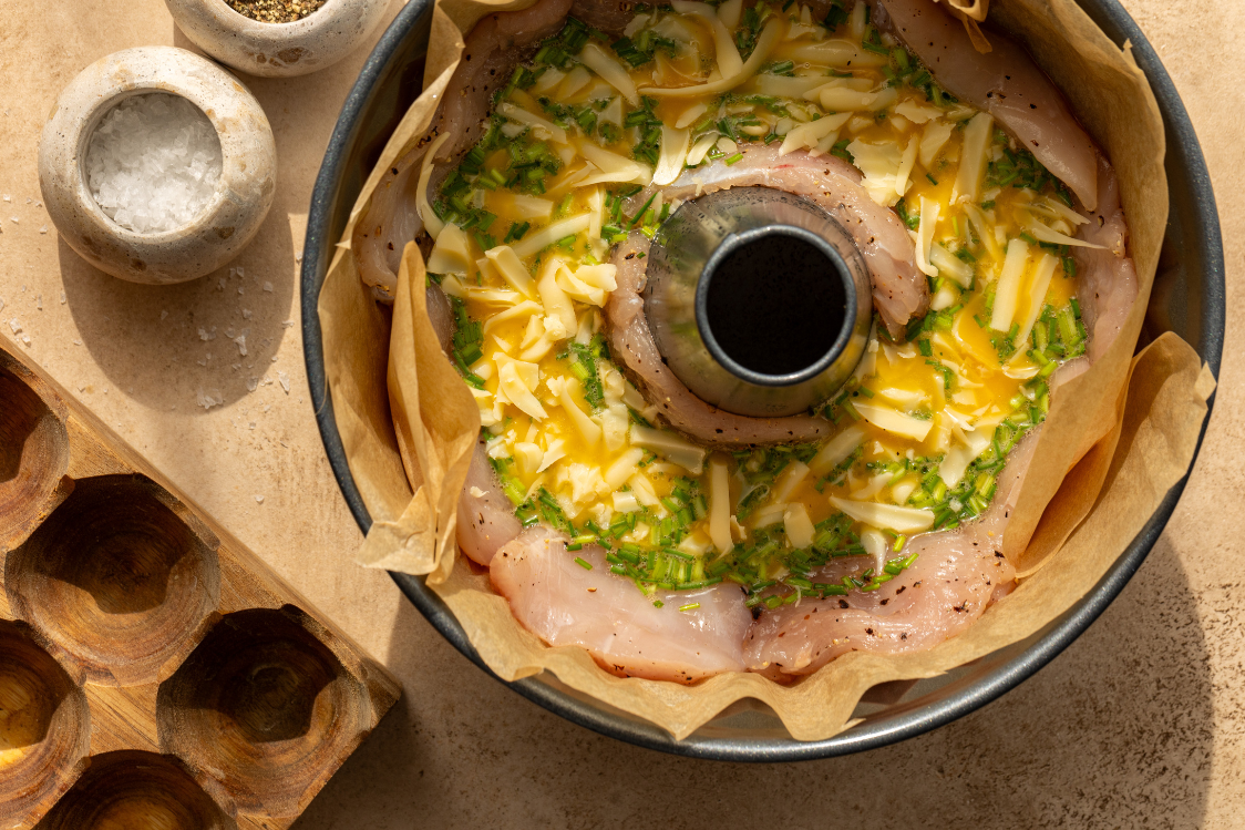 Kalup za tortu obložite papirom za pečenje. Na dno i po rubovima složite komade piletine. Prelijte smjesom od jaja i pospite ostatkom sira. Na vrh posložite preostalo meso.