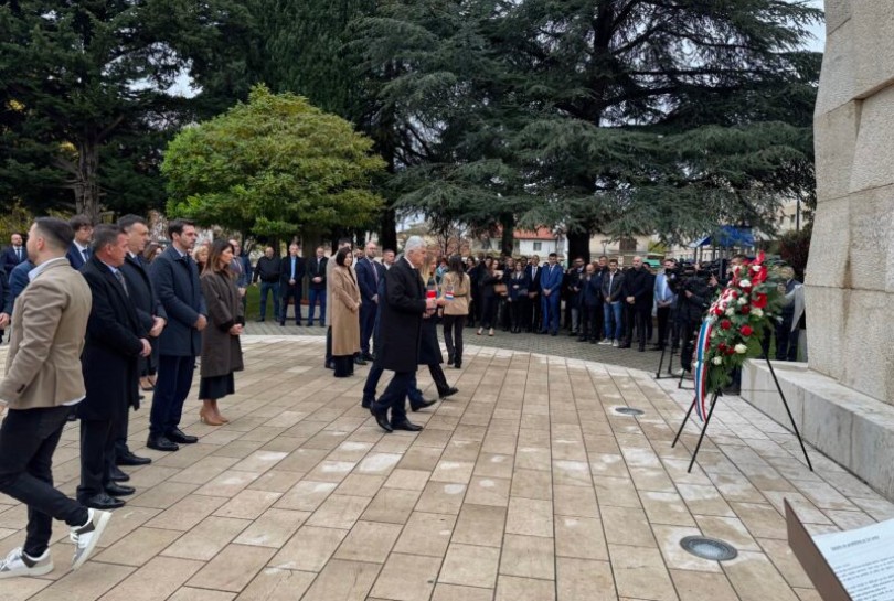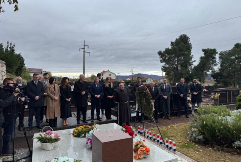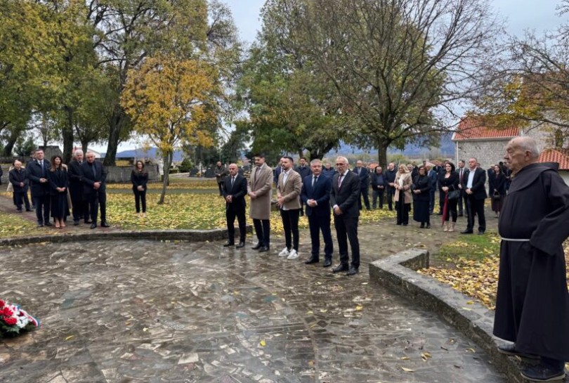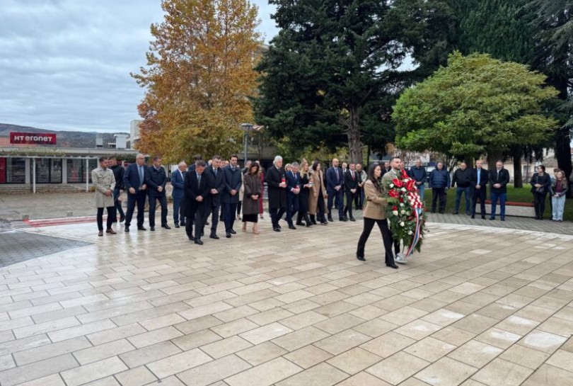 Potom su predstavnici Općine Grude, zajedno s izaslanstvom Hrvatskog narodnog sabora, položili svijeće i zajednički vijenac kod spomen-obilježja u Parku hrvatskih velikana u Grudama.