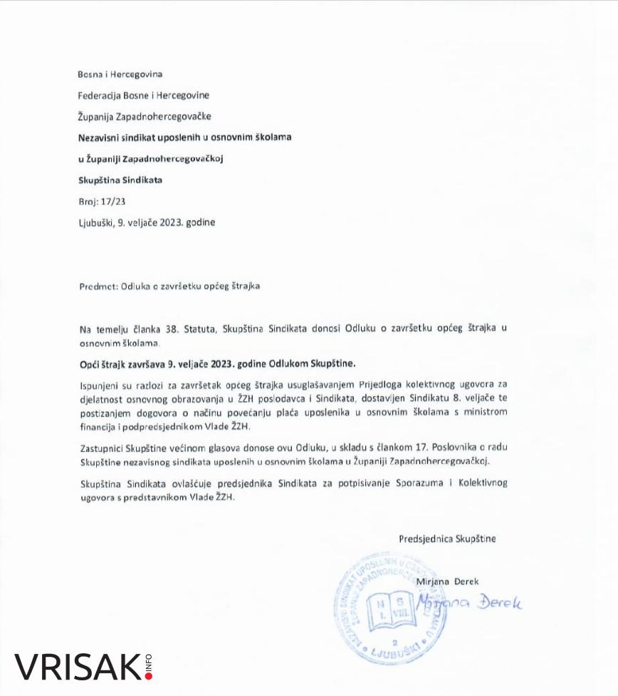 Vrisak.info donosi službeni dokument o prekidu štrajka: