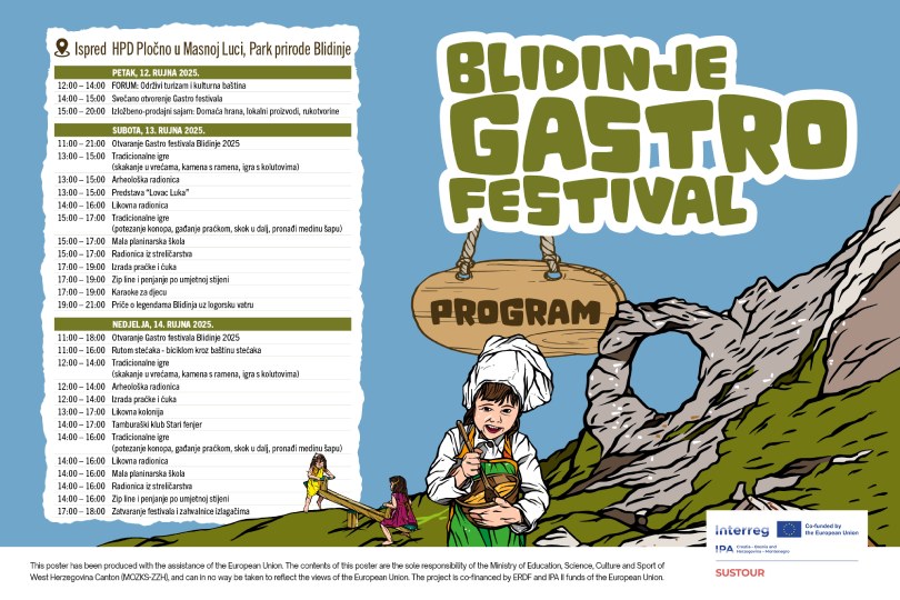 Gastro festival Blidinje 2025 zamišljen je kao događaj koji povezuje obitelj, zajednicu i posjetitelje kroz gastronomiju, kulturu, igru i sport u netaknutoj prirodi Parka prirode Blidinje. Projekt je sufinanciran sredstvima ERDF-a i IPA II fondova Europske unije.