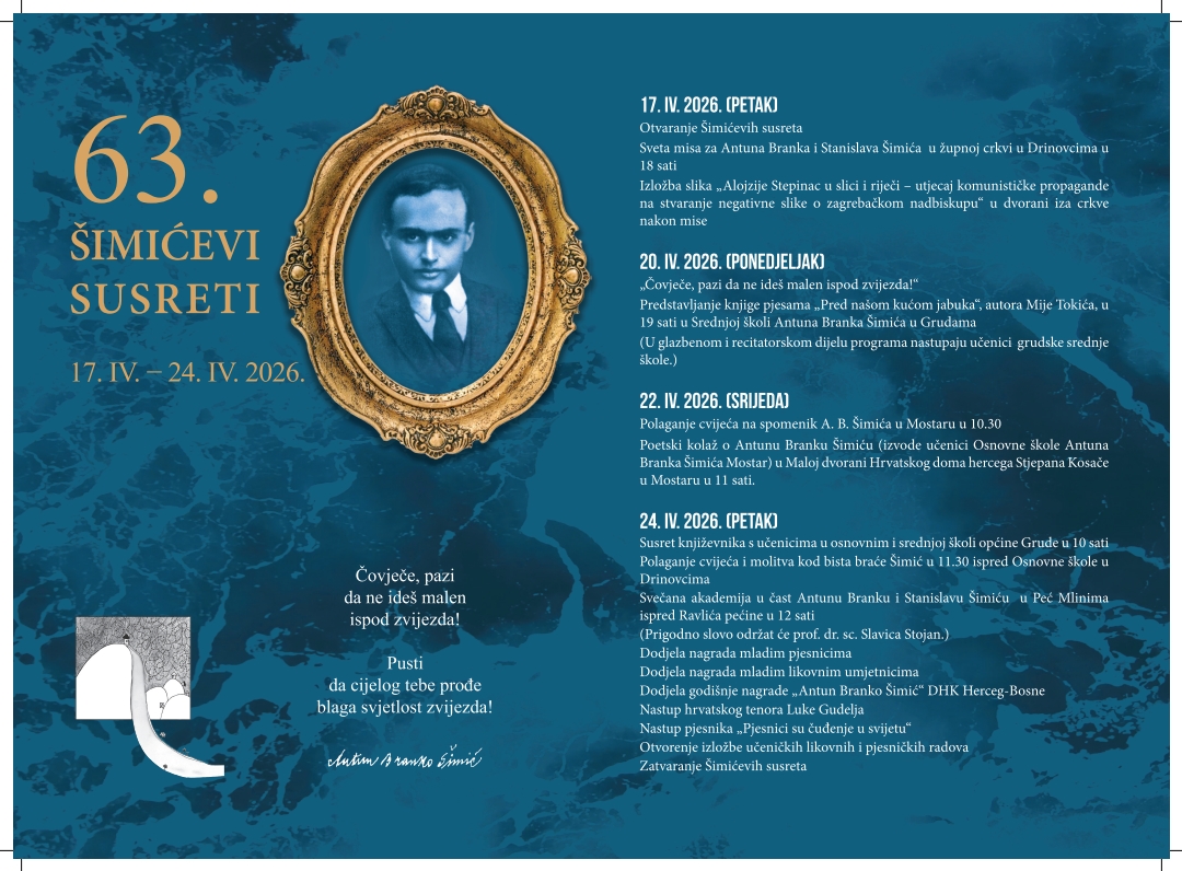Šezdeset treći Šimićevi susreti, posvećen pjesnicima Antun Branko Šimić i Stanislav Šimić, održat će se od 17. do 24. travnja na području Grude, Drinovci i Mostar.