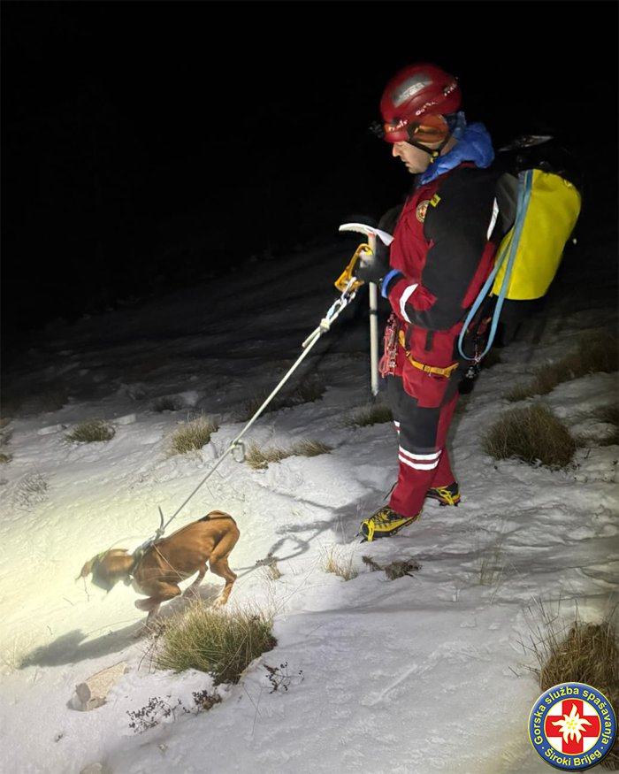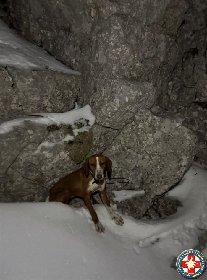 Prema informacijama koje je objavila služba, pas je u nedjelju pratio trag divlje životinje te je završio na zaleđenom terenu, odakle je skliznuo u strme, gotovo vertikalne stijene.