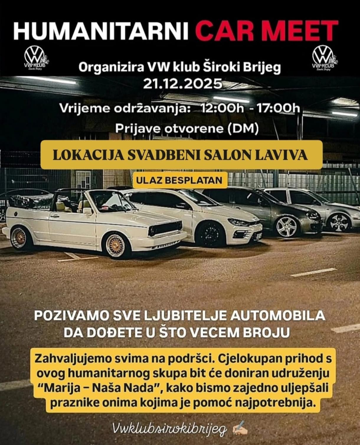 Zbog iznimno velikog interesa i rekordnog broja najavljenih vozila, organizatori humanitarnog Car Meeta koji će se održati 21. prosinca 2025. premjestili su događaj na novu, sigurniju i prostraniju lokaciju – parking Svadbenog salona Laviva u Širokom Brijegu