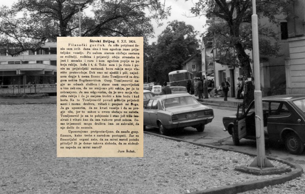 Na to Tomljenović povadi pištolju prijeteći meni i momu društvu, vičući i psujući mi Boga. Ja ga upozorim, da ne kvari veselje i da se progje sile, jer to zakon u ovom slučaju ne nalaže. Tomljenović je na to pobjesnio i stao još više izazivati i vikati kao da ima vukove pred sobom. Samo trijeznosti moga društva ima se zahvaliti, da nje došlo do nesreće.