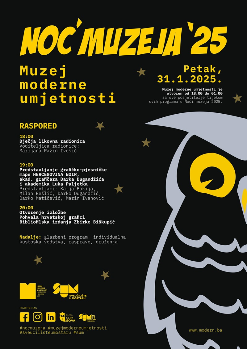 Muzej moderne umjetnosti Sveučilišta u Mostaru i ove godine sudjeluje u nadaleko poznatoj hrvatskoj kulturnoj manifestaciji Noć muzeja koja će biti upriličena u petak, 31. siječnja. U organizaciji Hrvatskog muzejskog društva jubilarna 20. Noć muzeja održat će se u brojnim hrvatskim muzejima, galerijama i znanstveno-obrazovnim institucijama, a Muzej moderne umjetnosti Sveučilišta u Mostaru već četvrtu godinu zaredom sudjeluje u ovoj značajnoj kulturnoj manifestaciji, kao jedini muzej u gradu Mostaru.
