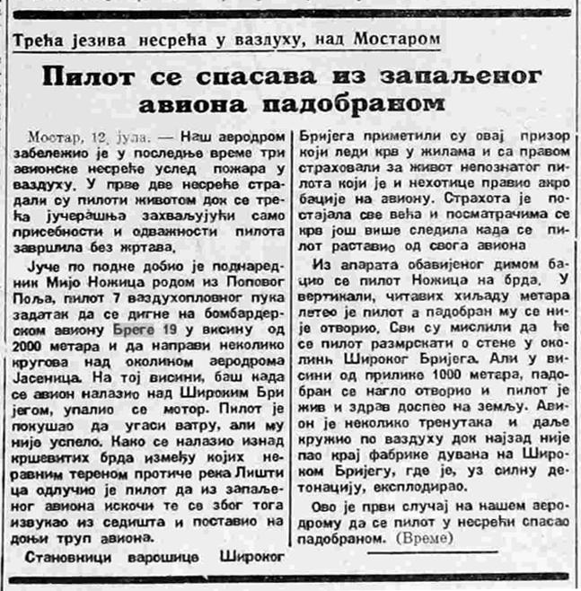Stanovnici Širokog Brijega svjedočili su nesvakidašnjem prizoru na nebu. Prema opisu iz novina, pilot je ustao sa sjedala i prebacio se na donji dio trupa aviona kako bi se pripremio za skok.