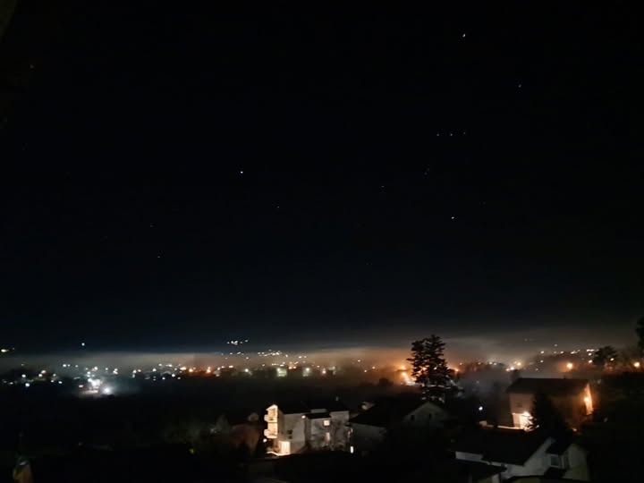 Sitna svjetala iz kuća i ulica raspršuju se kroz maglu, stvarajući dojam mirnog, tihog grada koji spava pod zvjezdanim nebom. Tamno nebo prošarano zvijezdama dodatno naglašava kontrast između hladne noći i topline svjetala iz doline.
