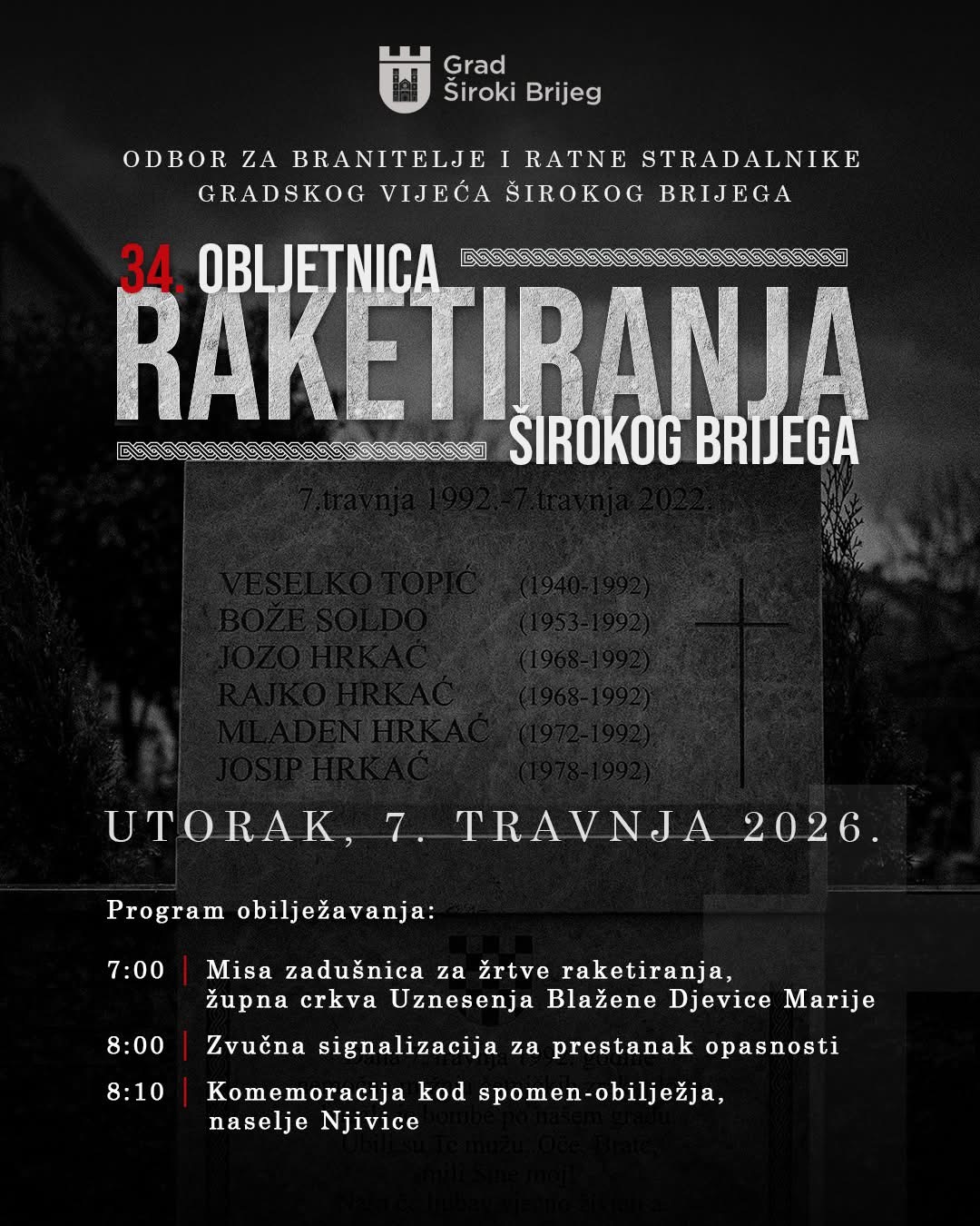 U Širokom Brijegu će u utorak, 7. travnja 2026. godine, biti obilježena 34. godišnjica raketiranja grada, jednog od najtežih i najtragičnijih dana u njegovoj novijoj povijesti.