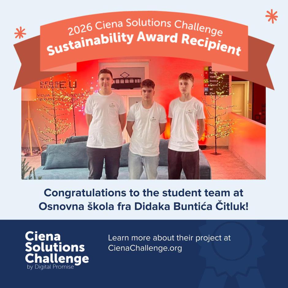 Inače, Ciena Solutions Challenge besplatni je globalni dizajnerski izazov koji poziva edukatore i učenike da dizajniraju rješenja koja se bave problemima u njihovim zajednicama. Koristeći Ciena Solutions, učenici će istražiti veliku ideju, postavljati promišljena pitanja, istražiti svoj izazov i djelovati kako bi stvorili rješenje. Počevši od rujna 2025. do 10. ožujka 2026., edukatori su se mogli prijaviti s idejama učeničkih timova za nagradu od 3000 USD za izrađene projekte, piše Večernji.ba.