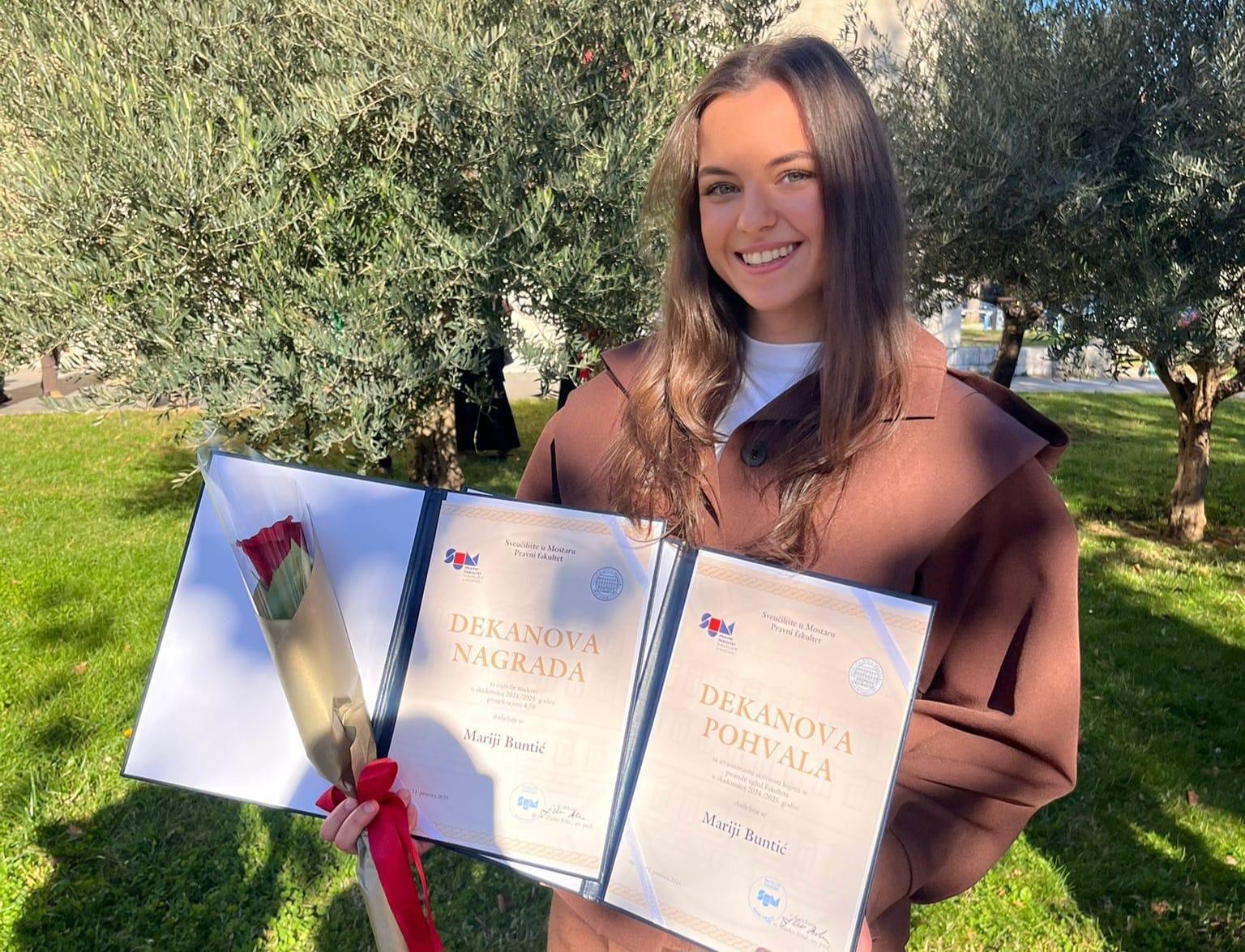 Posušanka Marija Buntić, studentica treće godine Pravnog fakulteta Sveučilišta u Mostaru, dobitnica je Dekanove nagrade za ostvareni prosjek ocjena 4,58 za akademsku 2024./2025. godinu, kao i Dekanove pohvale za iznimne rezultate ostvarene na studentskim natjecanjima.