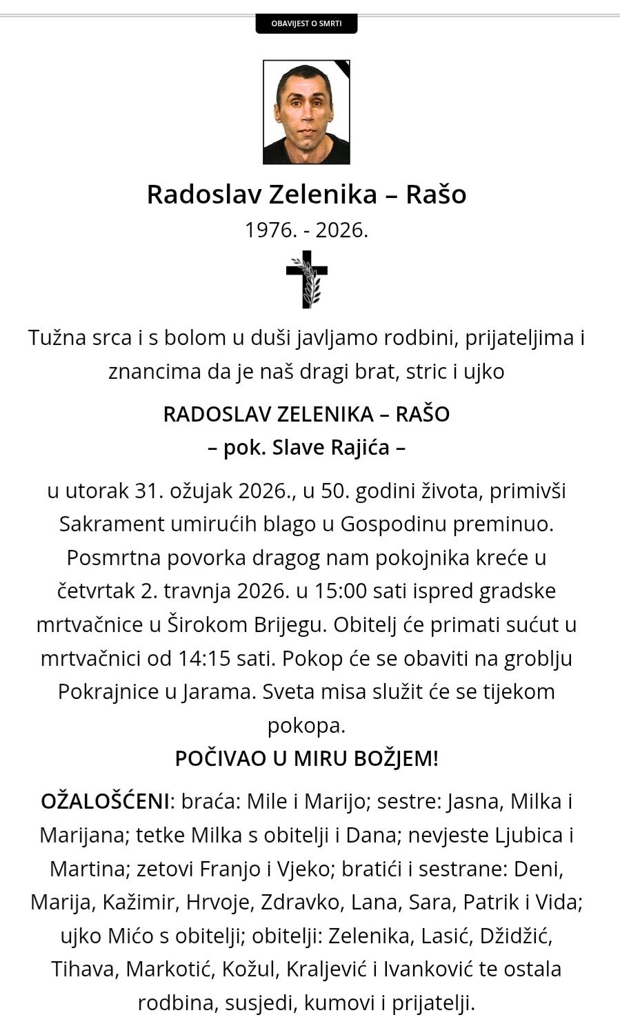 Posljednji ispraćaj Radoslava Zelenike bit će održan u četvrtak, 2. travnja 2026. godine u Širokom Brijegu, dok će pokop biti na groblju Pokrajnice u Jaramama.