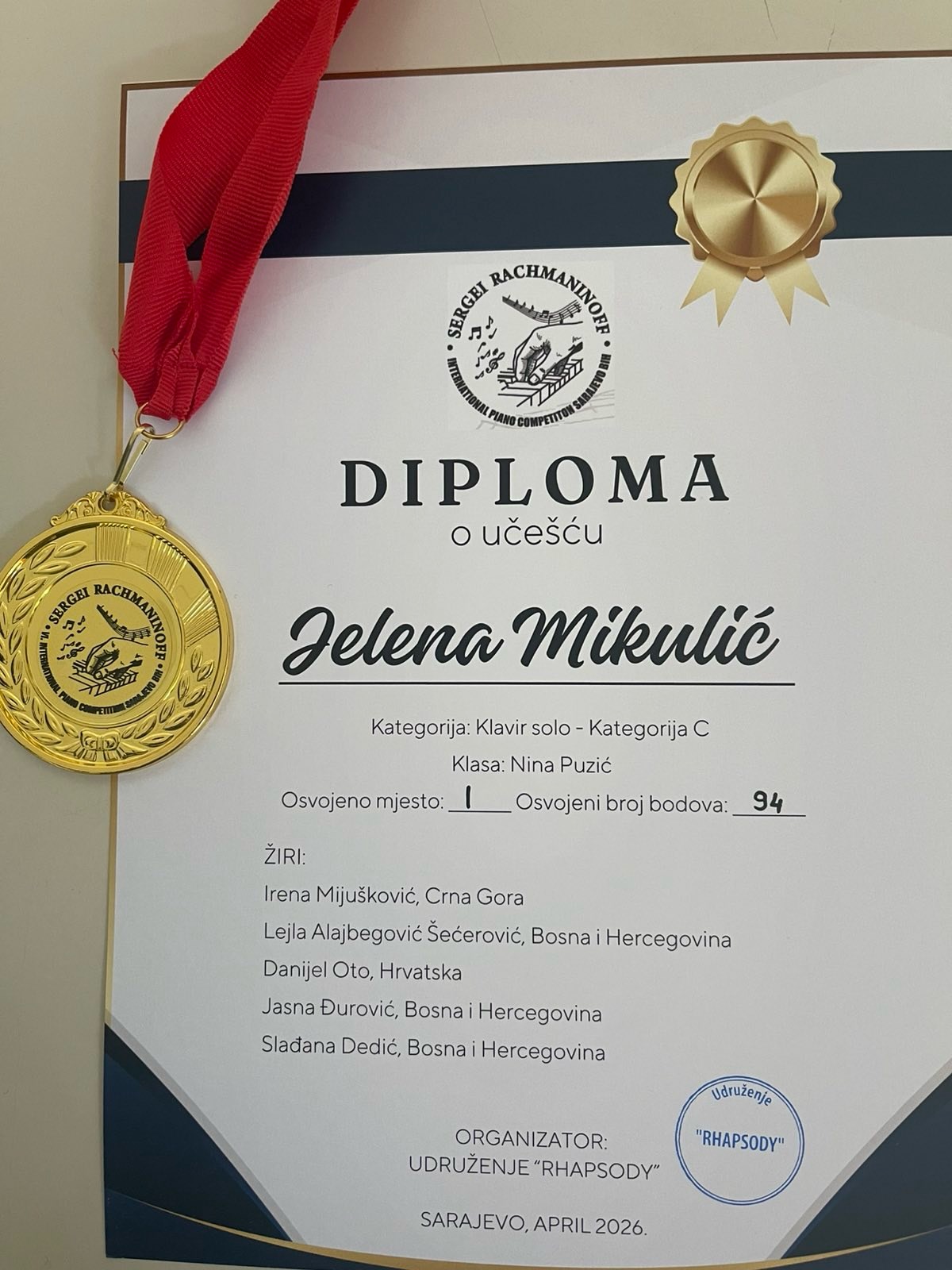 Učenica Glazbene škole Široki Brijeg, Jelena Mikulić, ostvarila je zapažen uspjeh na 6. izdanju ovog natjecanja. U disciplini klavir solo, Kategorija C, osvojila je I. nagradu s ukupno 94 boda, čime je potvrdila visoku razinu svog izvođačkog umijeća i kontinuitet uspješnog rada.