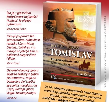 U povodu završetka obilježavanja 1100. obljetnice Hrvatskoga Kraljevstva te uoči 10. obljetnice smrti Mate Ćavara (1931. – 2016.), hrvatskoga pjesnika, publicista i domoljuba iz Širokog Brijega, najavljuje se promocija njegove knjige Recital – drama TOMISLAV / Hrvatska, živote moj – Izabrane pjesme.