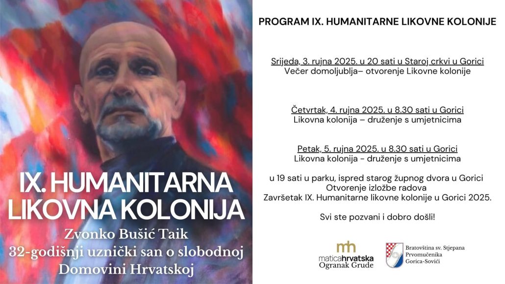 U srijedu, 3. rujna 2025. godine s početkom u 20 sati, u ambijentu Stare crkve u Gorici održat će se svečana Večer domoljublja, kojom započinje IX. Humanitarna likovna kolonija.