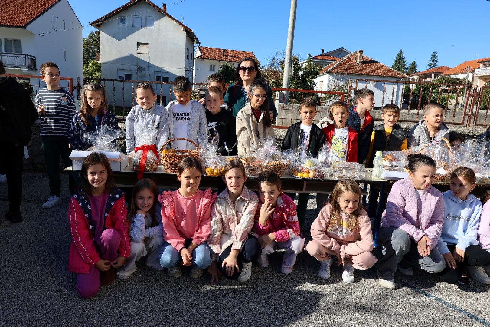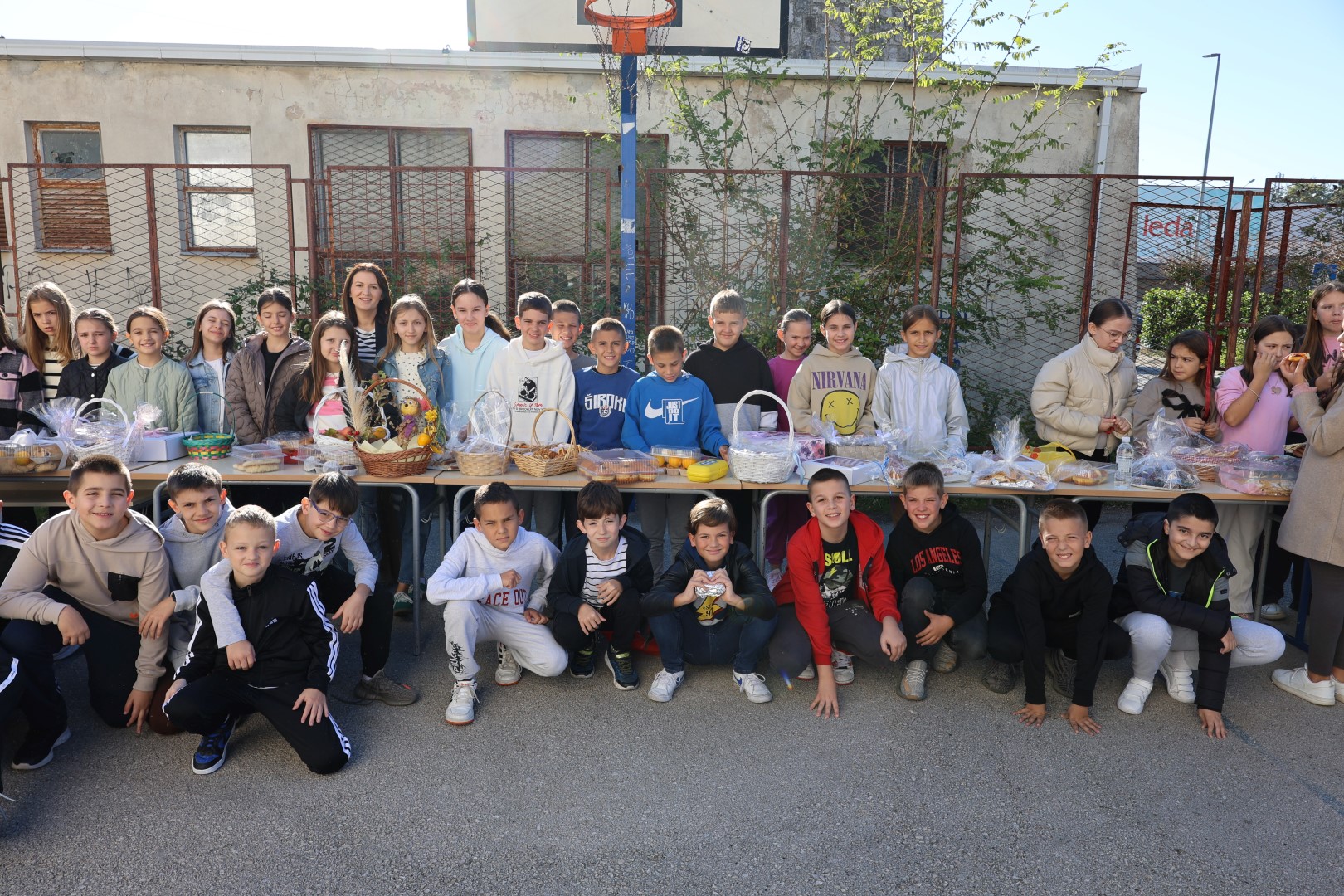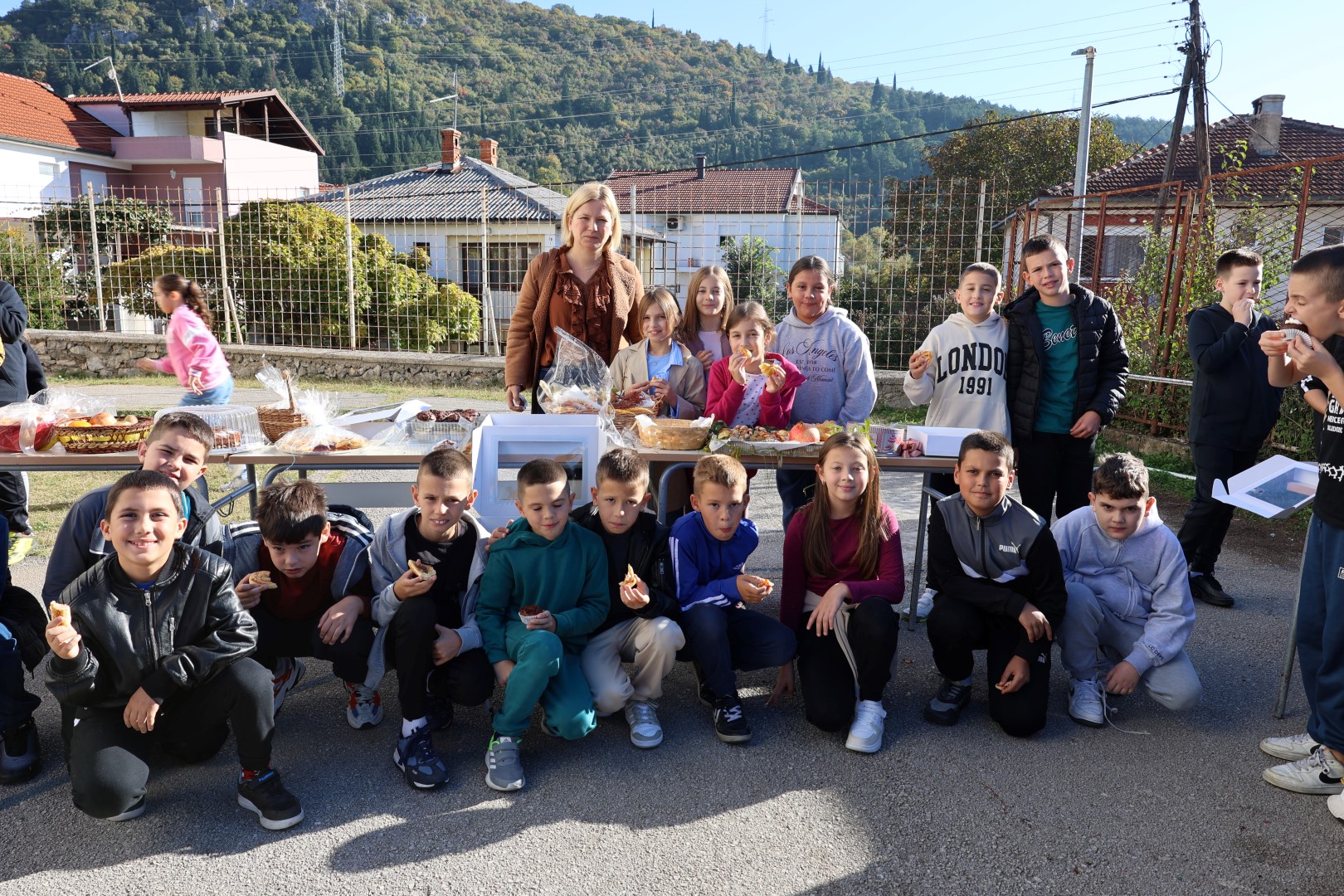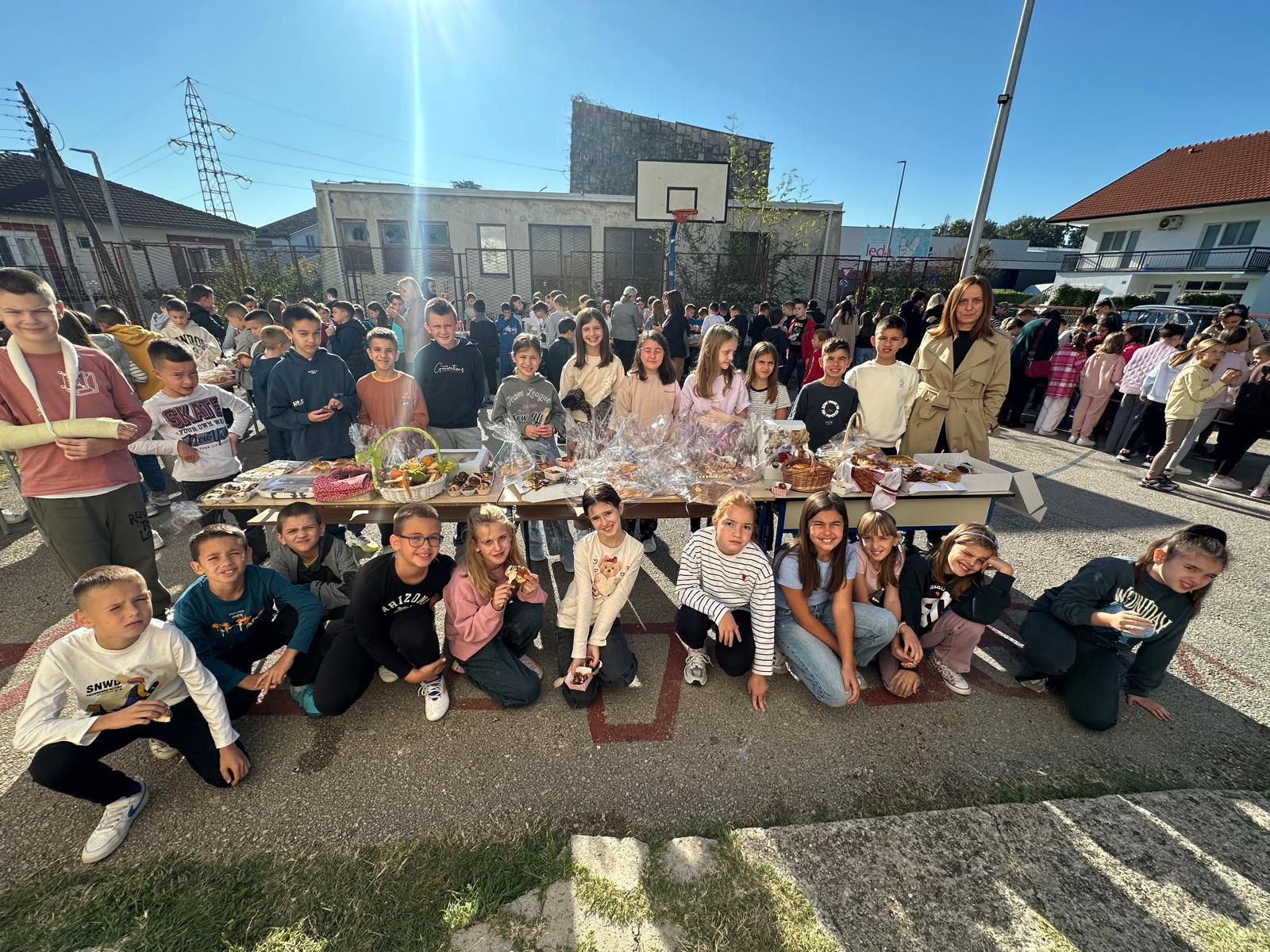Učiteljice su marljivo ukrasile školu plodovima jeseni, a spremačice su se pobrinule da svi priređeni proizvodi budu lijepo posloženi na stolovima, postavljenim na školskom igralištu.