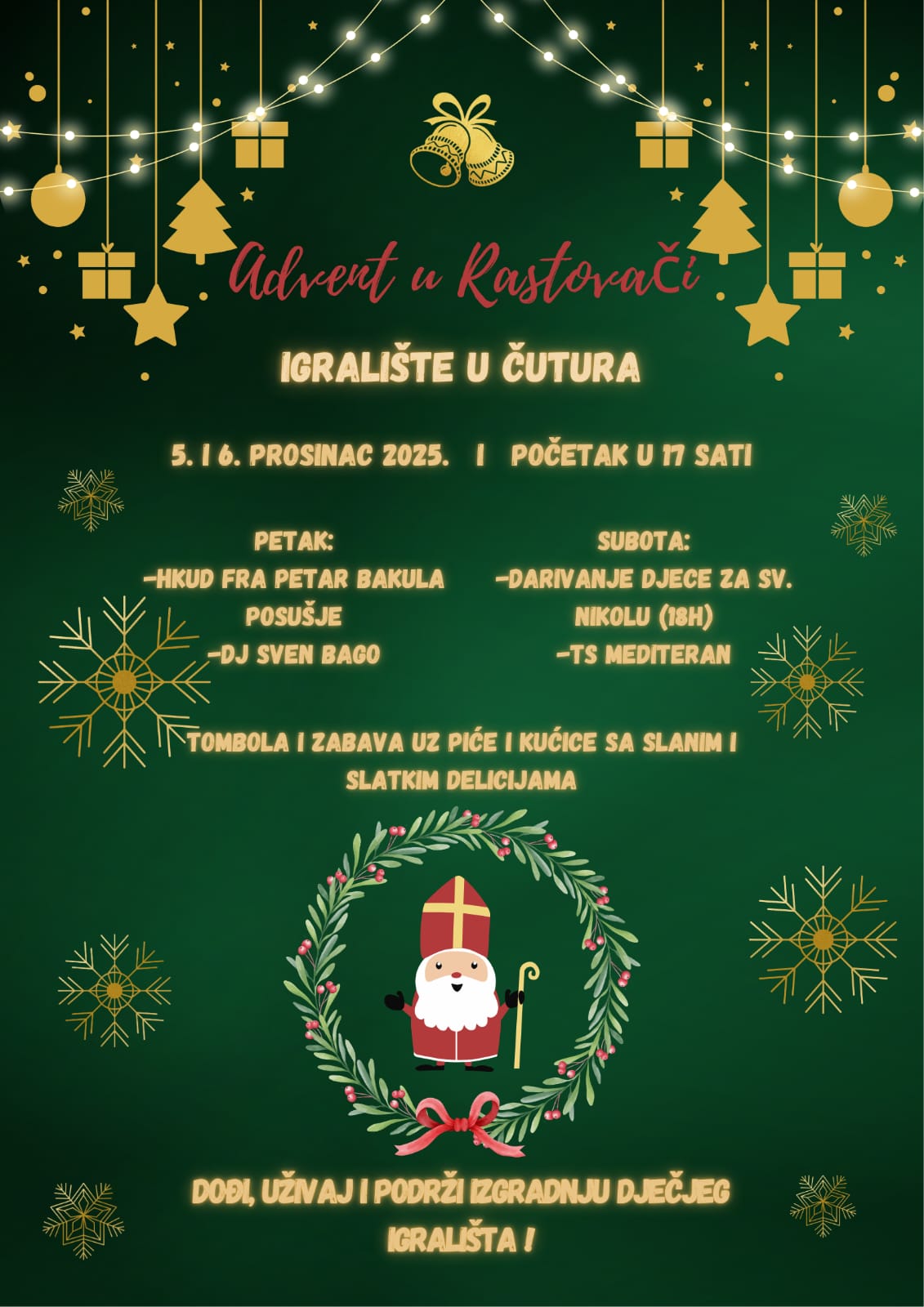 U petak 5.12. nastupaju mladi iz HKUD fra Petar Bakula i DJ Sven Bago U subotu 6.12. nam dolazi sv. Nikola koji će darovati djecu od 18h, a za glazbeni dio pobrinut će se tamburaški sastav Mediteran.