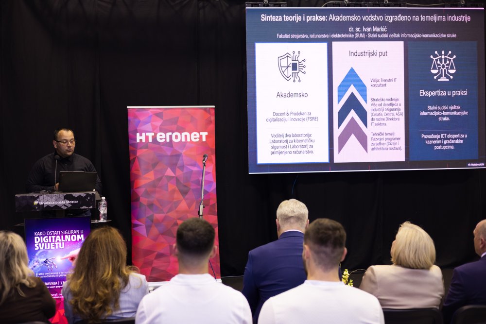 U sklopu sajamskog programa HT Eroneta prodekan za digitalizaciju i inovacije Fakulteta strojarstva, računarstva i elektrotehnike Sveučilišta u Mostaru doc. dr. sc. Ivan Markić održao je predavanje o temi „Kako ostati siguran u digitalnom svijetu“.