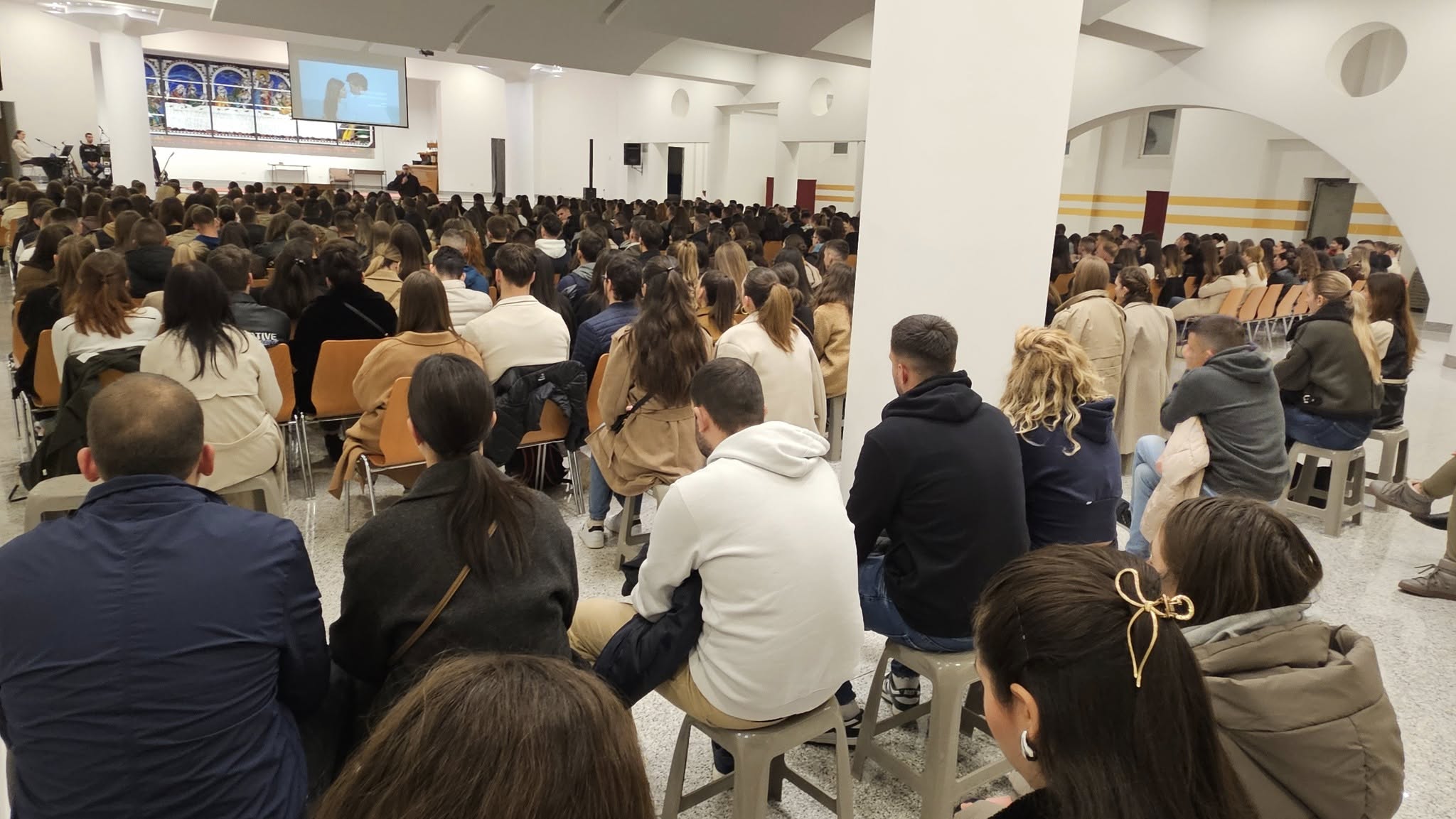 Kripta je i ovoga puta bila prepuna – oko 500 mladih došlo je poslušati predavanje na temu „Muško i žensko kako Bog zapovijeda“, o kojoj je govorio fra Serđo Ćavar. U svom izlaganju fra Serđo je govorio o dostojanstvu muškarca i žene, njihovim ulogama i međusobnom odnosu kroz biblijsku perspektivu od Adama i Eve do današnjih vremena.