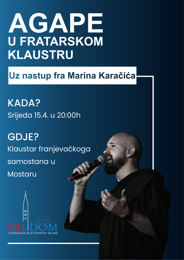 U srijedu 15. travnja je novi vjeronauk za studente i mlade u Mostaru. Susreti se će biti posebnog karaktera jer će biti u klaustru franjevačkog samostana. U klaustru će biti glazbeni nastup fra Marina Karačića. Uz fra Marinove pjesme mladi će se družiti s fratrima i uz „slatki“ stol imati besplatnu tombolu.