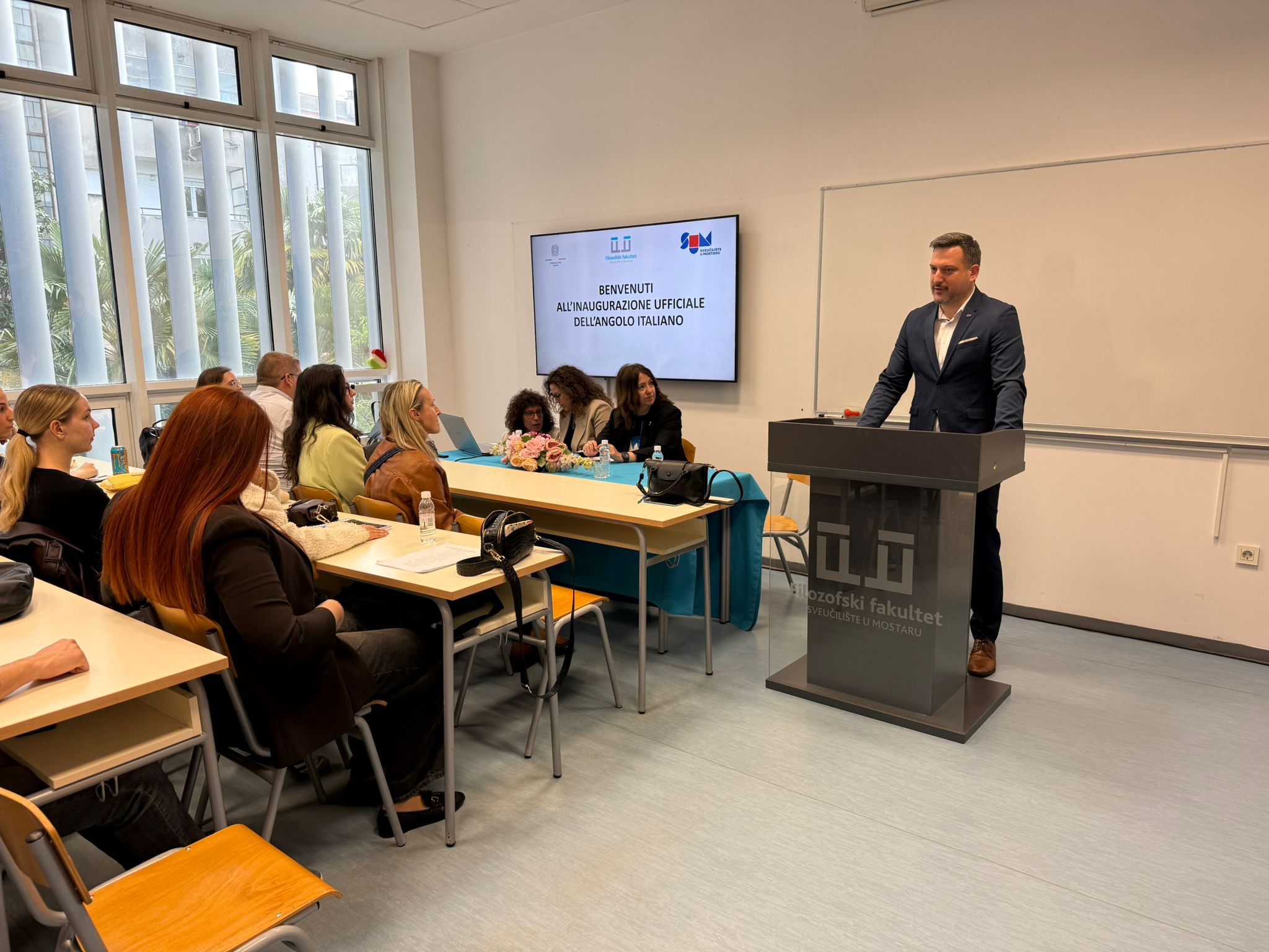 Veleposlanica Italije u Bosni i Hercegovini Nj. E. Sarah Eti Castellani otvorila je Talijanski kutak u učionici 30 na Filozofskom fakultetu Sveučilišta u Mostaru.