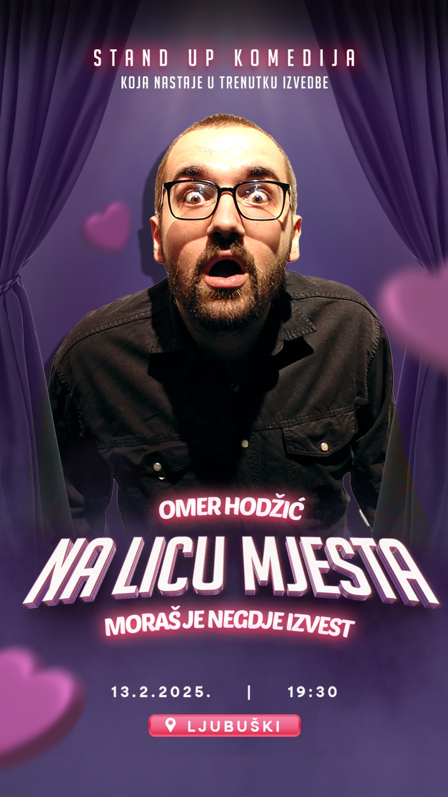 Dan ranije možete pogledati njegovu improvizacijsku komediju “Na licu mjesta” u Caffe Baru Bambus, inače rezidentnom mjestu ove predstave u Ljubuškom. Rezervacije (obavezne) moguće su u lokalu ili na broj 063 475 302.