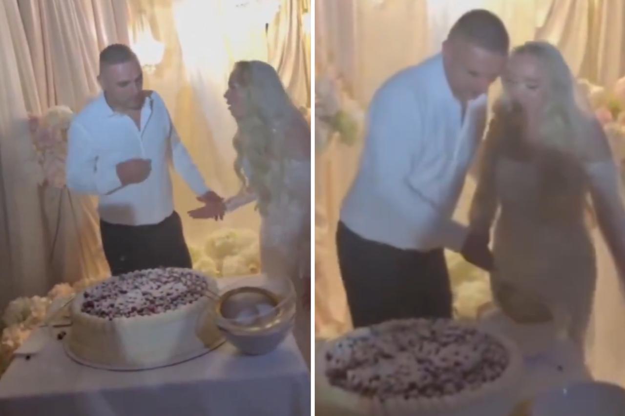 Na snimci se vidi kako mlada i mladoženja zajedno ukrašavaju svadbenu tortu, dok ih gosti okružuju, snimaju i bodre. U jednom trenutku mladoženja umoči prst u tortu i poliže kremu, što kod mlade izaziva očito nezadovoljstvo. Prema prikazanom, ona mu prigovara zbog tog poteza, no reakcija koja slijedi šokirala je sve prisutne.
