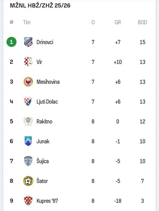 Drinovci su trenutno prvi s 15 bodova i gol-razlikom +7, dok ih u stopu prate Vir (+10), Mesihovina (+6) i Ljuti Dolac (+6), sve tri momčadi s po 13 bodova. Svi su odigrali po sedam utakmica, pa su karte posve otvorene.