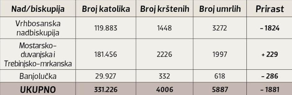 Na području Vrhbosanske nadbiskupije, kao i prethodnih godina, zabilježen je najveći pad broja katolika. Tamo je prirodni prirast negativan i u minusu je za 1824 osobe. A do toga se broja došlo tako da se oduzme broj rođenih i umrlih. A broj krštenih je 1448, dok je broj umrlih u prošloj godini bio 3272 te su na kraju zabilježena ukupno 119.883 katolika. Najbrojnija je Mostarsko-duvanjska i Trebinjsko-mrkanska biskupija, u kojima je u prošloj godini živjelo 181.456 katolika. Kršteno je 2226 osoba, dok ih je umrlo 1997 s pozitivnom bilancom od 229 više krštenih nego umrlih. Banjolučka biskupija je najmanja, a tamo je na kraju prošle godine bilo 29.927 katolika. Krštenih je bilo 332, a umrlih 618, što znači da imaju negativan prirast -286. Na razini države kršteno je 4006 vjernika, dok ih je pak umrlo 5887, što čini razliku od 1881 katolika manje. Iako se trend smanjenja broja Hrvata katolika nastavlja, on se godinama usporava. U posljednje četiri godine, od gotovo 4000 katolika manje u 2020. te 3620 u 2021. godini ili pak 2711 u pretprošloj godini, prošle je godine taj broj pao ispod 2000. To može sugerirati na više potencijalnih odgovora, no najpoznatiji hrvatski demograf dr. Stepan Šterc upozorava da se dugi niz godina Hrvati iseljavaju iz BiH i Hrvatske te je primjetan negativan prirodni prirast. – Taj je trend jako dugo negativan i u tim trendovskim kretanjima imate uvijek neke oscilacije. Povremeno te oscilacije mogu pokazivati pozitivan smjer. Ali, s obzirom na broj iseljenih i prosječnu starost ukupne populacije, teško je očekivati ključni iskorak bez strateških poteza koji se moraju napraviti vezano uz opstanak. Štoviše, rekao bih da je hrvatska populacija u Bosni i Hercegovini ugroženija nego hrvatska domicilna populacija u Hrvatskoj. To je zato što je teško očekivati, uz ostalo, realizaciju drugog revitalizacijskog modela kroz useljavanje. U takvim prostorima to je teško očekivati i neće se dogoditi samo od sebe. Ako se demografska problematika i opstanak ne stave na stratešku razinu i to ne postane ključna problematika svakog izvršnog odlučivanja, onda se ništa neće dogoditi – upozorava dr. Šterc. On godinama poziva vlasti u Zagrebu, ali i Hrvatskoj na donošenje strateških odluka važnih za revitalizaciju nacije. Jedna od mjera je i pokušati vratiti ljude u zemlju. Recept za tu grupaciju je omogućiti im jednostavnije i jeftinije poslovanje u zemlji umjesto u inozemstvu. – To mora biti poticajni model i taj povratak u pravilu ide kroz investicije identitetske populacije iz iseljeništva u ta područja. Irska, primjerice, oslobodi svaku investiciju iz iseljeništva poreza na dobit na deset godina – smatra demograf. On dodaje kako je važno, uz to, poticati mlade na brak jer se 80 posto djece još uvijek rađa u brakovima.