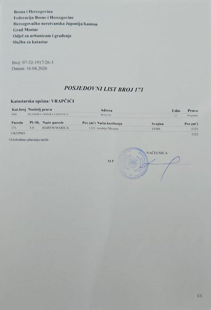 Sukladno tome, Grad Mostar je dužan izvijestiti javnost da njegova Služba za katastar nije vršila promjenu posjednika niti bilo kakvu drugu promjenu na parceli označenoj kao k.č. 173 KO Vrapčići (Harem Marića), upisanoj u posjedovni list 171. Na toj parceli kao posjednik se vodi Islamska vjerska zajednica, s navedenim načinom korištenja groblje/mezarje, o čemu javnosti stavljamo na uvid odgovarajući posjedovni list.