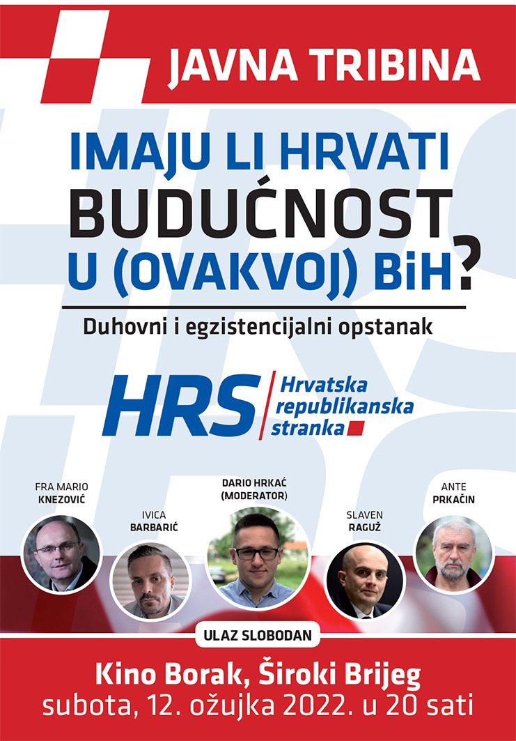 U subotu 12.03.2022. godine s početkom u 20 sati u kinu „Borak“ u Širokom Brijegu, na javnoj tribini na ovu temu ćemo diskutirati s fra Mariom Knezovićem, Antom Prkačinom, Ivicom Barbarićem i Slavenom Ragužem.