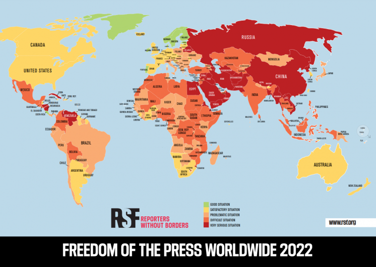 Ove godine situacija je kategorizirana kao “vrlo loša” u rekordnom broju od 28 zemalja širom svijeta, a 12 zemalja – među njima Bjelorusija i Rusija – uvršteno je na tzv. crvenu listu gdje je situacija s medijskim slobodama najgora. U najgorih 10 zemalja što se tiče medijskih sloboda je i Mjanmar – gdje je državni udar u veljači 2021. unazadio medijske slobode desetak godina – zatim Kina, Turkmenistan, Iran, Eritrea, i Sjeverna Koreja.