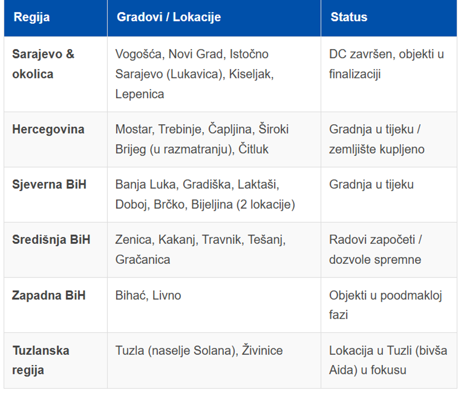 Zapadna Bosna zasad uključuje Bihać i Livno, gdje su objekti u poodmakloj fazi pripreme, dok je u Tuzlanskoj regiji fokus stavljen na Tuzlu, točnije naselje Solana (bivša lokacija Aide), te Živinice.