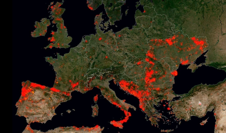 Crvenim su točkama prikazana opožarena područja 2022. godine. Crvenim točkama prekriveno je gotovo pola Hrvatske, posebno Dalmacija i njeno zaleđe, ali su rasprostranjene i u dijelu unutrašnjosti, od Dalmacije pa do Karlovca. Bosna i Hercegovina se gotovo sva “crveni”, osim dijela Brčko Distrikta.