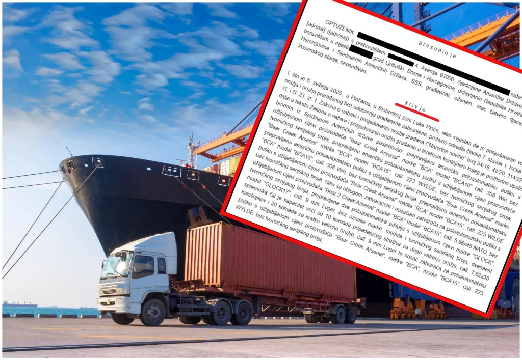 Prema presudi sutkinje, on je 6. svibnja 2025. u slobodnoj zoni luke Ploče u teretnom kontejneru, koji je sam ranije poslao iz SAD‑a, posjedovao više prepravljenih poluautomatskih pušaka američkog proizvođača Bear Creek Arsenal, modele BCA10 i BCA15 različitih kalibara, sve bez tvorničkih brojeva.