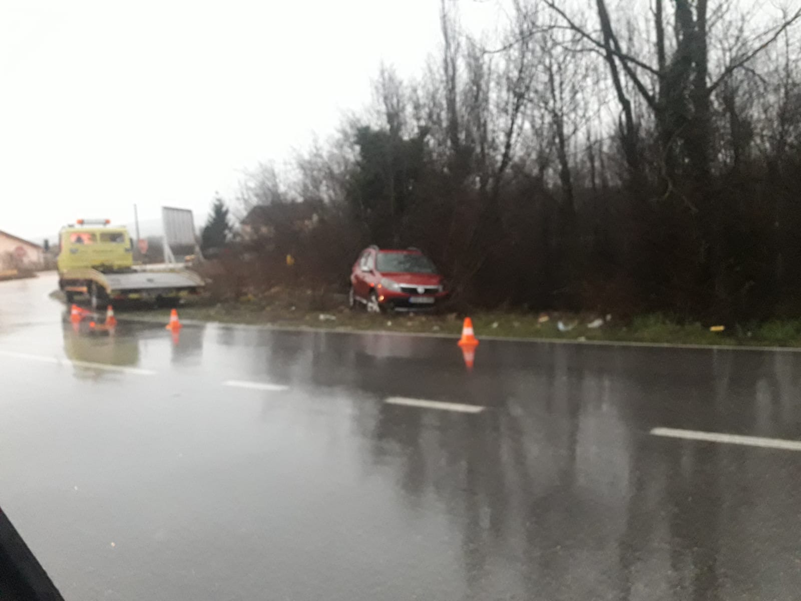 S ceste je sletilo vozilo marke Dacia Sandero. Pretpostavlja se kako je uzorak ove nesreće sklizak kolnik.