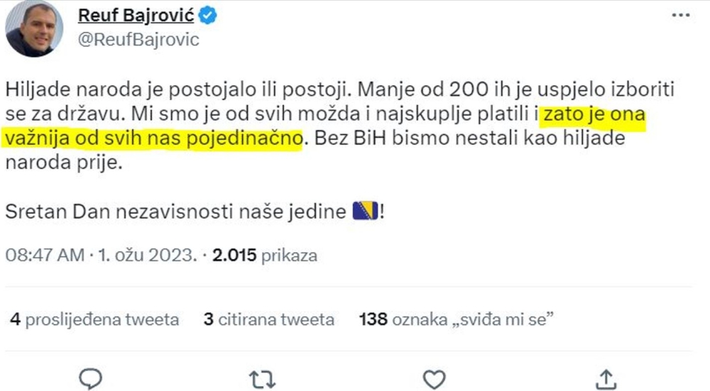 “Hiljade naroda je postojalo ili postoji. Manje od 200 ih je uspjelo izboriti se za državu. Mi smo je od svih možda i najskuplje platili i zato je ona važnija od svih nas pojedinačno. Bez BiH bismo nestali kao hiljade naroda prije”, napisao je Bajrović na Twitteru.