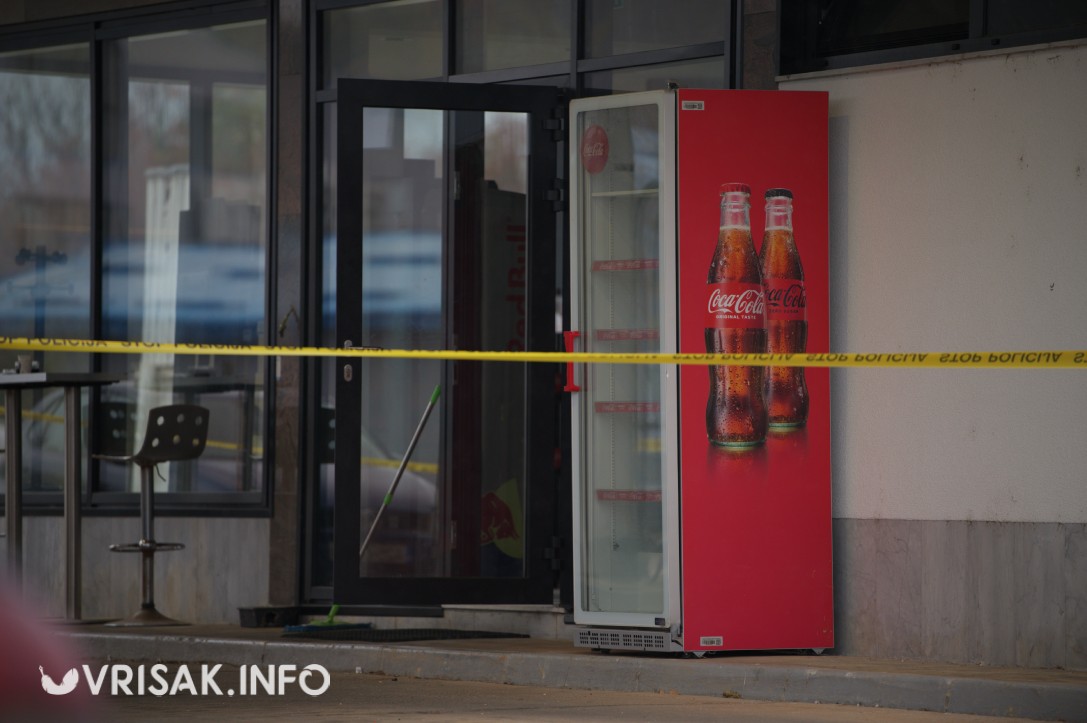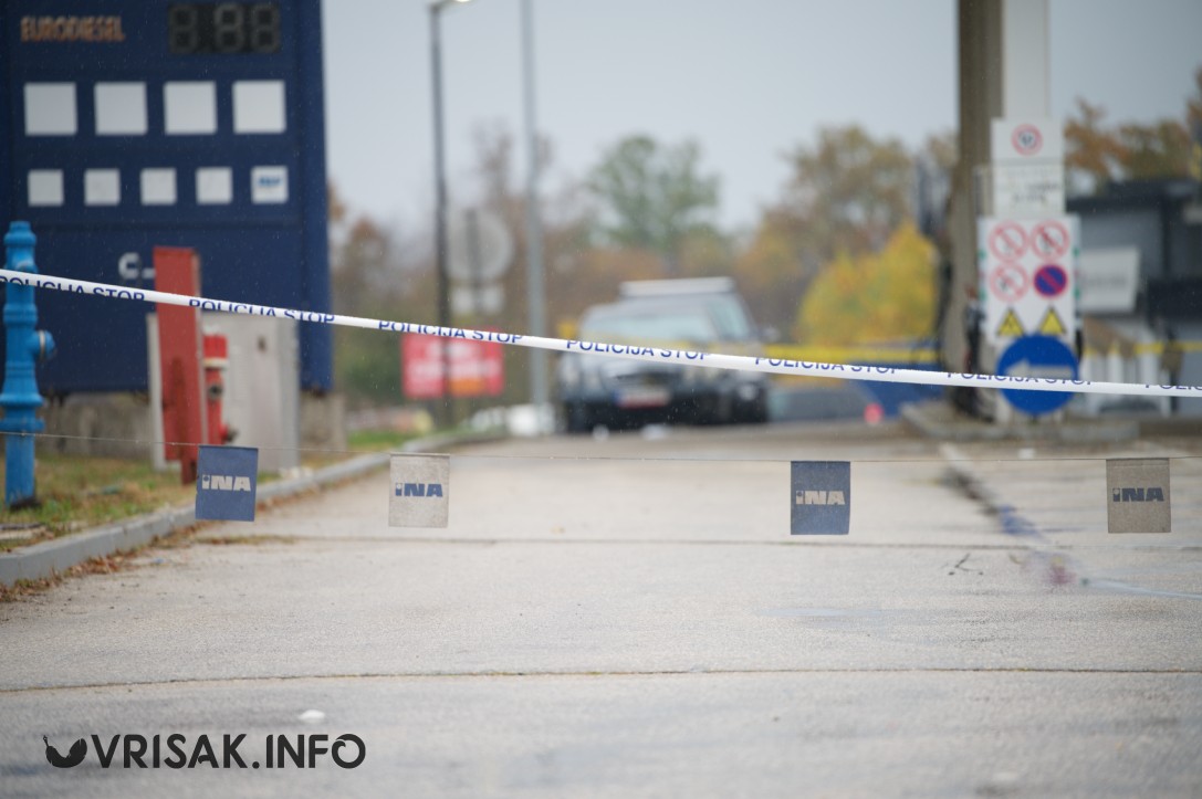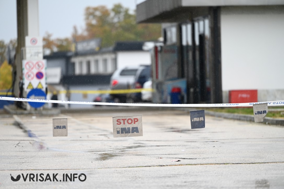 Vidljivo je da su ulazna vrata objekta razvaljena, a oko benzinske postaje postavljena je policijska traka koja označava zabranu prilaska.