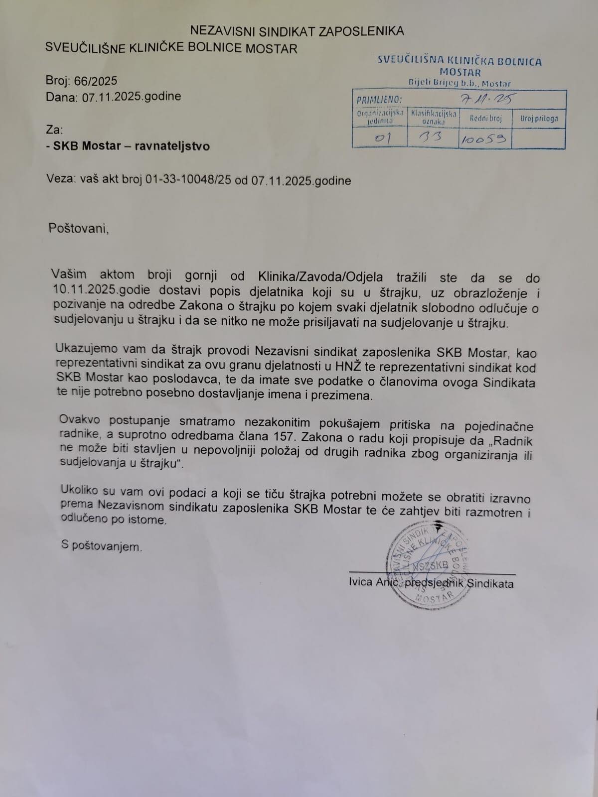 U jeku štrajka zdravstvenih djelatnika u Hercegovačko-neretvanskoj županiji (HNŽ), ravnateljstvo Sveučilišne kliničke bolnice Mostar zatražilo je od pojedinih Klinika, Zavoda i Odjela da do 10. studenoga 2025. godine dostave popise djelatnika koji sudjeluju u štrajku.