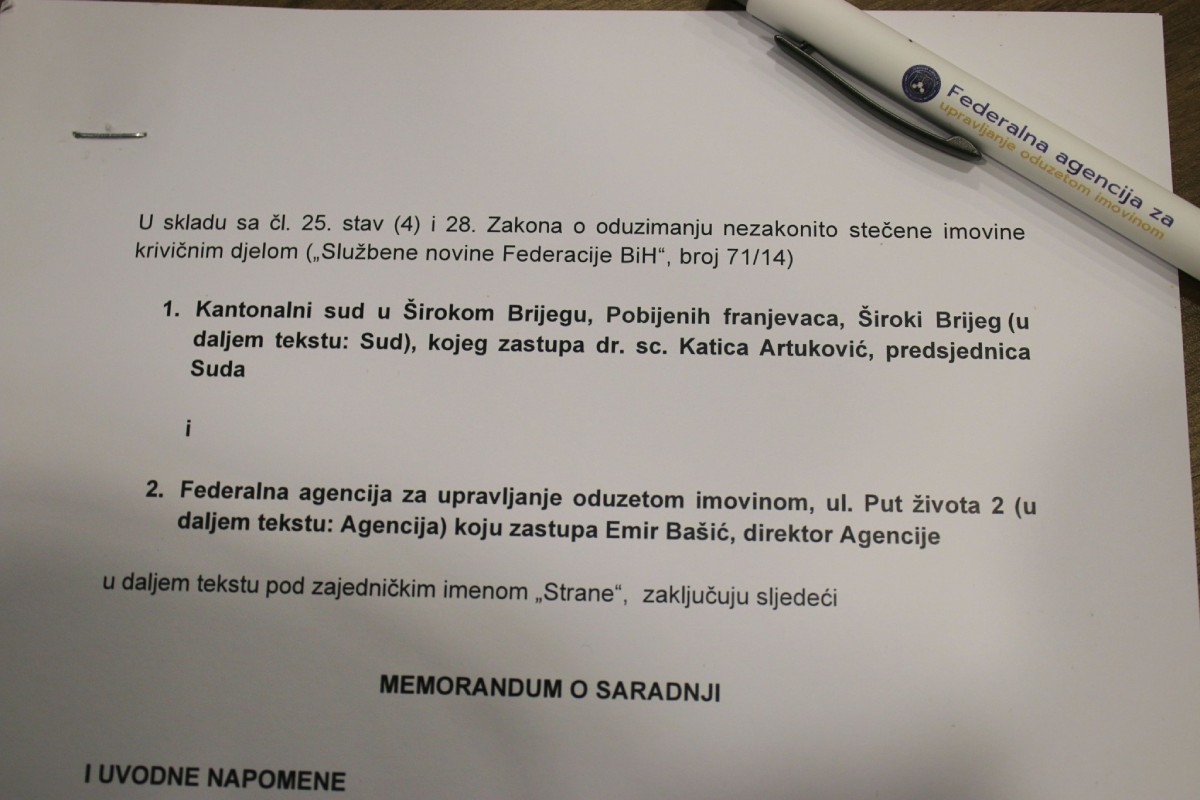 Memorandum su potpisali dr. sc. Katica Artuković, predsjednica Županijskog suda u Širokom Brijegu, i Emir Bašić, direktor Federalne agencije za upravljanje oduzetom imovinom.